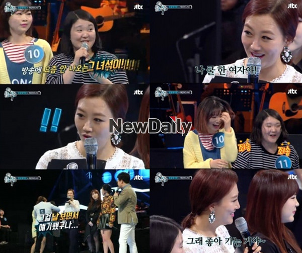 가수 장윤정이 '그녀석' 노홍철의 언급해 쿨한 반응을 보였다.지난 7일 방송된 JTBC '백인백곡-끝까지 간다'에는 배우 김선경, 뮤지컬 배우 김희원, 가수 정동하, 허각, missA 민, 박지민, 박시환, 개그맨 박성광이 출연했다.이날 장윤정은 일반인 선곡단이 가져온 노래에 대한 힌트를 제공하기 위해 한 참가자와 인터뷰를 진행했다. 이 참가자는 "내 노래는 요즘 방송에 나오지 않는 '그 녀석'이 리메이크한 곡이다"고 노홍철을 간접적으로 가르켰다.이에 문희준은 "그 얘기를 왜 하냐"며 참가자를 말렸고, 장윤정은 "그걸 나 보면서 얘기했구나"라며 민망한 웃음을 지었다. 이내 장윤정은 "괜찮다. 뭐 어떠냐. 나 쿨한 여자야"라고 대응해 폭소를 자아냈다.[장윤정 노홍철, 사진=JTBC '백인백곡-끝까지간다' 캡처]