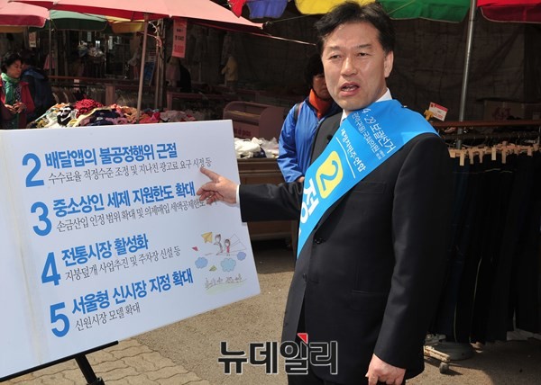 4.29 재보궐선거 관악을 지역에 출마한 정태호 새정치민주연합 후보가 8일 오후 서울 관악구 미성동 마트 앞에서 공약을 발표하고 있다.