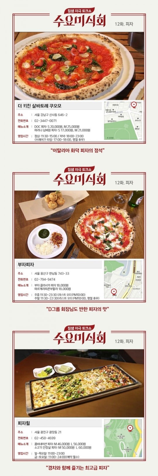 '수요미식회' 피자 3대 맛집에 대한 관심이 뜨겁다.지난 8일 방송된 tvN '수요미식회'에서는 '피자' 편으로 국내 피자 3대 맛집이 공개돼 시청자들의 군침을 자극했다. 이날 소개된 '수요미식회' 피자 3대 맛집은 더 키친 살바토레 쿠오모, 부자피자, 피자힐이다.먼저, 게스트로 출연한 이현이, 씨엔블루 강민혁이 입을 모아 극찬한 '더 키친 살바토레 쿠오모'는 정통 나폴리 피자 집으로 서울 강남구 신사동에 위치해 있다.일본과 이탈리아 혼혈 셰프인 살바토레 쿠오모가 있는 이곳은 국내 최초로 나폴리 피자협회의 인증을 받은 '마리나라 No.1', 나폴리 피자대회에서 우승한 'D.O.C 피자' 등이 유명하다.한남동에 위치한 '부자피자'는 대기업 회장들이 단골 맛집이다. 화덕피자 맛에 반한 두산 박용만 회장은 자신의 SNS에 극찬을 남겼으며, 이후 유명세를 탔다. 대표 메뉴로 고기를 넣지 않은 마르게리타 콘부팔라와 부자 클라시카 피자가 인기다.세 번째로 소개된 '피자힐'은 워커힐 호텔에 위치한 맛집으로 한강과 서울 전경이 한 눈에 내려다 보여 데이트 명소로 연인들이 많이 찾는다. 콤비네이션 피자와 안창살 피자, 콰트로 피자가 대표적인 메뉴다.맛 칼럼니스트 황교익은 피자힐에 대해 "가장 정통적인 한국 피자"라고 극찬하기도 했다.['수요미식회' 피자 맛집, 사진=tvN '수요미식회' 홈페이지]