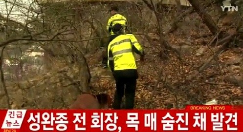 YTN은 "등산로에서 30m 가량 떨어진 나무에 목을 매 숨진 성완종 전 경남기업 회장의 시신이 수색견에 의해 발견됐다"고 밝혔다.
