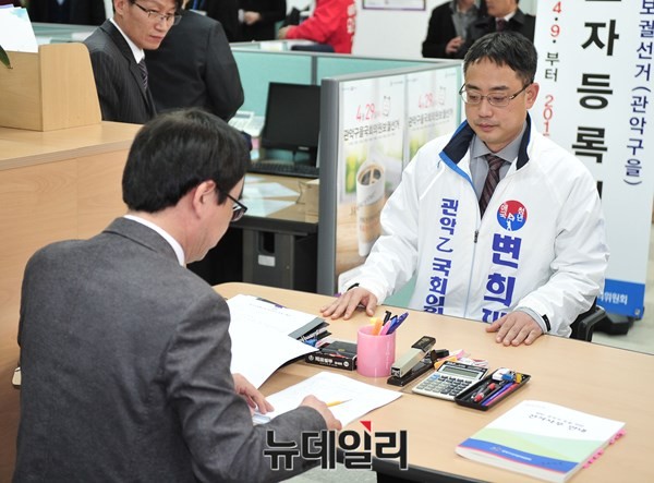 서울 관악을 4.29 재보궐선거 무소속 변희재 예비후보가 9일 오전 서울 청룡동 관악구선거관리위원회 사무실에서 후보 등록을 하고 있다.