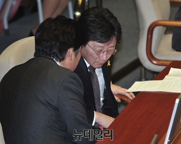 유승민 새누리당 원내대표가 13일 오후 서울 여의도 국회 본회의장에서 열린 정치분야 대정부 질문에서 원유철 정책위의장과 대화를 나누고 있다.