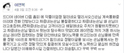 또한 이연복 세프는 "많이 노력하고 있는데 손님들의 만족을 정말 100프로 채워드리기가 힘드네요. 정말 이 글을 보시는 손님들께서는 한풀 꺾이고 오시면 정말 맛있게 친절하게 모실 수 있도록 노력하고 열심히 하겠습니다. 당분간 이해해주시길 간절히 빕니다. 죄송합니다"라고 사과했다.