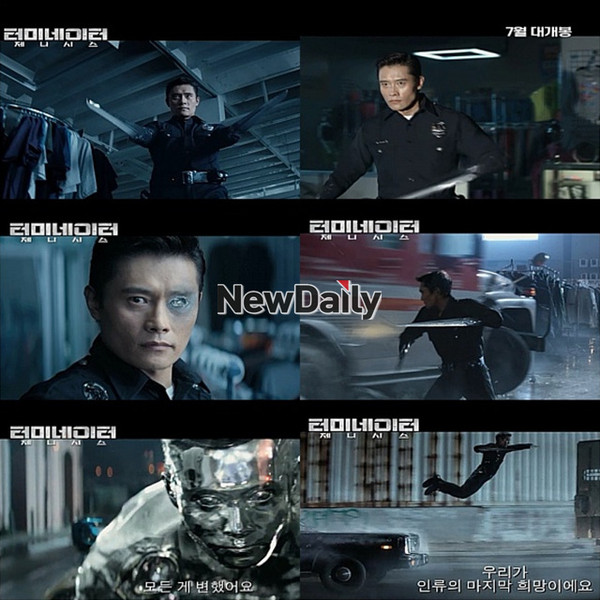 '터미네이터5' 새 예고편이 공개된 가운데, 배우 이병헌이 미친 존재감을 드러냈다.14일 SF 액션 블록버스터 '터미네이터 제네시스'(감독 앨런 테일러, 이하 '터미네이터5')의 진화의 끝 '나노 터미네이터' 예고편이 공개돼 이목을 사로잡고 있다.공개된 새로운 영상은 미래와 과거에서 동시에 일어나는 역대급 전쟁의 스케일과 시리즈 사상 가장 강력한 적의 등장, 그리고 놀라운 반전을 예고하며 기대감을 더한다.존 코너의 탄생 자체를 없애려고 로봇 군단이 과거로 향하고 이를 저지하기 위해 존 코너의 부하 카일 리스가 뒤를 따른다. 어린 사라 코너와 그녀를 보호하고 있던 터미네이터 T-800은 그를 도와 로봇 군단과의 전쟁을 벌이지만 시간의 균열이 생기면서 인류의 미래는 점점 끝을 알 수 없는 곳을 향해 간다.특히, 한국배우 이병헌의 모습이 단연 눈에 띈다. 예고편 속 이병헌은 '터미네이터2'에 처음 등장해 관객들에게 쫄깃한 긴장감을 선사했던 액체 금속형 사이보그 T-1000 역할을 맡아 압도적인 존재감을 과시하고 있다.영화 '터미네이터' 리부트(Reboot) 시리즈의 첫 작품인 '터미네이터 제니시스'는 2029년, 존 코너가 이끄는 인간 저항군과 로봇 군단 스카이넷의 미래 전쟁과 1984년, 존 코너의 어머니 사라 코너를 구하기 위한 과거 전쟁을 동시에 그린다. 7월 1윌 국내 개봉 예정이다.['터미네이터5' 이병헌, 사진=영화 '터미네이터 제니시스' 예고편 캡처]