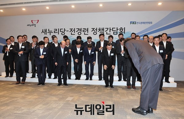 김무성 새누리당 대표가 14일 오전 서울 여의도 전경련회관에서 열린 [새누리당-전경련 정책간담회]에 참석해 참석자들과 인사를 하고 있다.