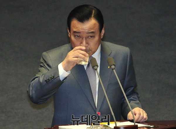 이완구 국무총리가 14일 오전 서울 여의도 국회에서 열린 본회의에서 의원들의 질문을 받던 중 물을 마시고 있다.