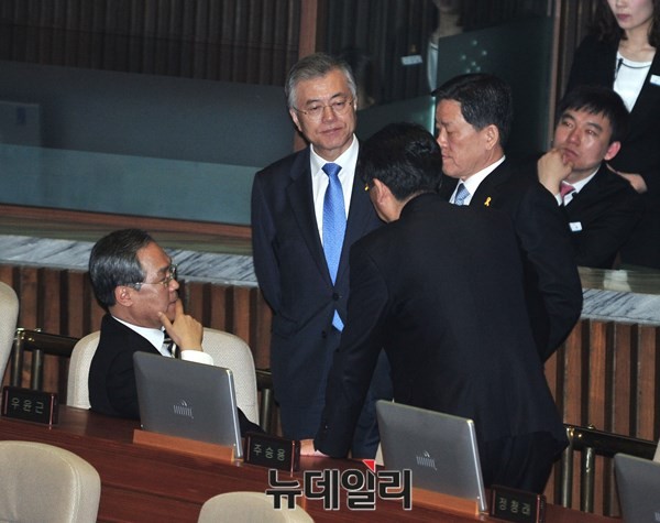 새정치민주연합 문재인 대표와 지도부가 16일 오전 서울 여의도 국회에서 열린 본회의에서 대화를 나누고 있다.