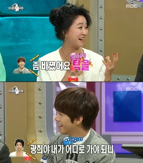 '라디오스타' 김부선이 광희의 성형을 폭로했다.지난 15일 방송된 MBC '황금어장-라디오스타'는 '앵그리 피플-화가 난다' 특집으로 김흥국, 김부선, 이훈, 제국의아이들 광희가 출연해 솔직한 입담을 선보였다.이날 김부선은 "아까 오자마자 이훈 씨가 광희에게 '좀 더 예뻐졌다'고 했다. 그랬더니 광희가 '턱을 좀 바꿨어요'라고 하더라"고 밝혔다.특히, 김부선이 "나는 (성형외과) 어디로 가야 되니"라고 묻자 광희는 "우리 병원으로 오면 된다. 내가 광고하는.."이라고 답해 폭소를 자아냈다.또한, 김부선은 "나는 제주도가 낳은 세계적인 난방투사다"라고 남다른 자부심을 드러내 눈길을 끌었다.[라디오스타 김부선, 사진=MBC '라디오스타' 방송 캡처]