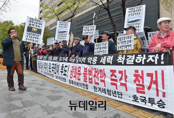 세월호 침몰 1주기인 16일 오후 서울 종로구 광화문KT 앞에서 어버이연합을 비롯한 애국단체가 [세월호 왜곡 선전, 선동하는 세력 척결], [광화문 불법 천막 철거]를 주장하며 기자회견을 가졌다.