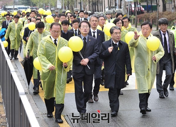 세월호 참사 1주기인 16일 오후 공식 합동분향소가 마련된 안산 단원구 화랑유원지에서 조희연 서울시교육감, 이재정 경기도교육감, 제종길 안산시장 등 추모객들이 단원고로 행진을 하고 있다..