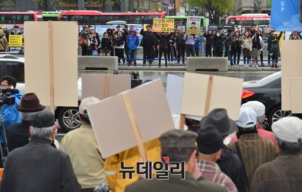 이에 앞서 오후 3시 30분부터 광화문KT 앞 도로에서 어버이연합을 비롯한 애국단체가 [세월호 왜곡 선전, 선동하는 세력 척결], [광화문 불법 천막 철거]를 주장하는 기자회견을 가졌다. 세종대로를 두고 세월호 1주기를 추모하기 위해 모인 시민들과 욕설이 오갔지만 별다른 충돌 없이 기자회견은 마무리됐다.