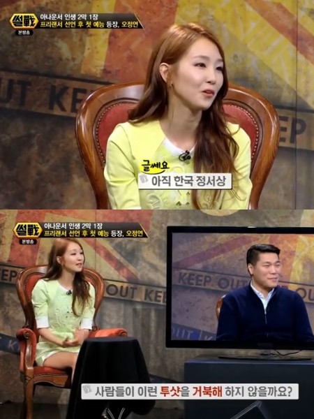 KBS 아나운서 출신 오정연이 '썰전'에서 전 남편 서장훈을 언급했다.지난 16일 방송된 JTBC '독한 혀들의 전쟁-썰전'에는 프리선언을 한 오정현이 출연해 솔직한 입담을 뽐냈다.이날 이윤석은 오정연에게 "이런 질문 드리기 곤란하지만 방송을 하다보면 서장훈과 마주칠 수도 있다. 만약 한 프로그램 제안이 들어오면 어떻게 할 거냐?"고 물었다.그러자 김구라는 "내가 봤을 때는 오정연은 할 것 같은데 서장훈은 안 할 것 같다"고 말해 웃음을 자아냈다.이에 오정연은 "아직 한국 정서상 사람들이 서장훈과의 투샷을 거북해 하지 않을까 싶다"라며 조심스러운 반응을 보였다.['썰전' 오정연 서장훈 언급, 사진=JTBC '썰전' 방송 캡처]
