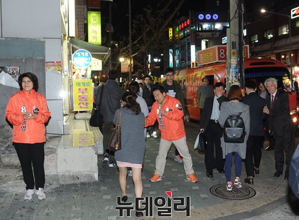 • 4·29 국회의원 재보궐선거 서울 관악을에 출마한 국민모임 정동영 후보가 21일 서울 관악구 신림동지하철 신림역 앞에서 지난 19일 새정치민주연합을 탈당한 이행자 서울시의원과 함께 지역 주민들에게 인사를 하고 있다.