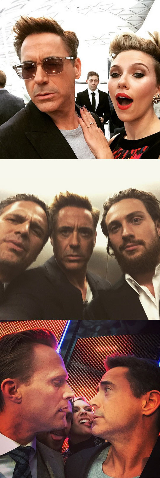 로버트 다우니 주니어가 런던 프리미어 비하인드 사진을 공개했다.로버트 다우니 주니어는 22일 자신의 인스타그램에 영국 런던에서 진행된 영화 '어벤져스2: 에이지 오브 울트론' 프리미어 레드카펫 뒷모습이 담긴 사진을 게재했다.공개된 사진 속 '블랙 위도우' 역의 스칼렛 요한슨은 '아이언맨' 로버트 다우니 주니어의 가슴에 손을 얹고 입을 벌린 채 익살스러운 표정을 짓고 있다.또 다른 사진에서 로버트 다우니 주니어는 비전 역을 맡은 폴 베타니와 '헐크' 마크 러팔로와 '퀵실버' 역의 아론 테일러 존슨 등과 다정한 포즈를 취하며 화기애애한 분위기를 물씬 풍겼다.한편, 영화 '어벤져스: 에이지 오브 울트론'은 더욱 강력해진 어벤져스와 평화를 위해서는 인류가 사라져야 한다고 믿는 '울트론'의 사상 최대 전쟁을 그린 액션 블록버스터. 오는 23일 개봉한다.[사진=로버트 다우니 주니어 인스타그램]
