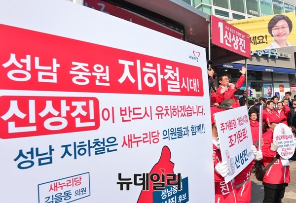 새누리당 김무성 대표를 비롯한 지도부가 22일 오후 성남 중원구 남한산성시장 입구를 찾아 성남 중원에 출마한 새누리당 신상진 후보를 지원했다.