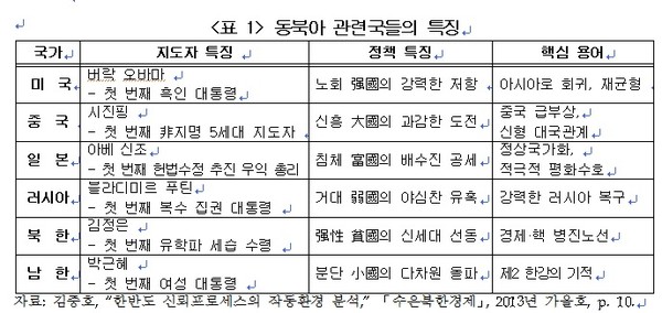 현재 동북아 관련국들(미·중·일·러·남·북)은 공통적으로 공세적인 정책입장을 갖고 있다고 해도 과언이 아니다. 동북아 관련국들의 국제관계는 그들의 국내정치 변화에 의해 상당히 영향을 받고 있다. <표 1>에서 보듯이, 2012년부터 동북아 관련국들내에서 권력교체과정을 통해 권력을 유지하거나 새롭게 등장한 지도자들은 대체로 새로운 비전과 정책목표를 내세우고 이전보다 더 과감하고 적극적인 정책추진을 시도하려는 경향을 보이고 있다.