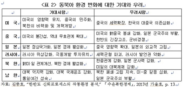 동북아 관련국들의 국내정치 변화는 대외관계를 보는 시각을 바꾸고 있으며, <표 2>에 정리된 것처럼 동북아 안보환경의 변화에 대한 새로운 기대와 우려를 갖게 한다. 간단히 말하면, 미국은 기존 질서를 위협하는 중국을 견제하고 싶어하며, 일본은 그러한 미국의 전략상황에 편승하여 그동안 제약받았던 군대보유를 시도하고자 하는 한편, 중국은 미국과 일본의 대중국 포위전략 전개에 대응하느라 분주하고, 러시아는 미중 갈등구조 속에서 그동안 약화된 위상의 재정립에 초점을 두며, 북한은 도발과 대화를 번갈아 사용하며 미국과의 대화 재개를 모색하고 있다.