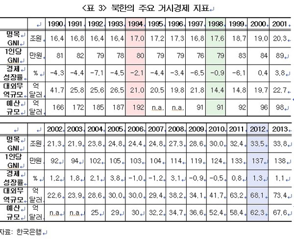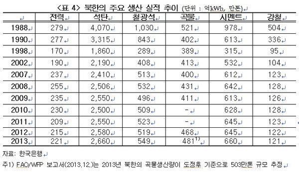 <표 3>에서 보듯이, 최근의 대외무역 및 경제성장률 등을 고려할 때 북한 경제는 최악의 상태에서 점점 벗어나고 있는 것으로 보인다. 1994년 김일성 주석의 사망 이후 북한 경제 지표들이 한동안 악화되었으나 김정일 정권이 출범한 1998년 이후 북한 경제는 조금씩 안정세를 보이기 시작했고 김정은 정권이 출범한 2012년에는 성장세를 보이고 있다. 그러나 <표 4>에서 보듯이 북한의 주요 생산 실적 추이를 살펴보면 북한 경제가 여전히 1980년대 후반 수준조차 회복하지 못하고 있음을 알 수 있다.