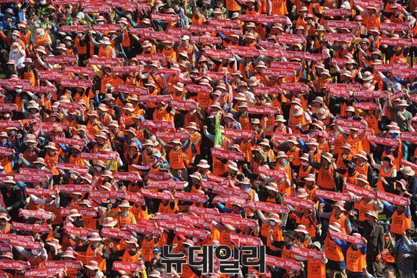 전국민주노동조합총연맹(민주노총)이 24일 오후 서울광장에서 총파업 집회를 열어 '정부 주도의 노동시장 구조개선 저지와 최저임금 인상' 등을 요구하며 구호를 외치고 있다.