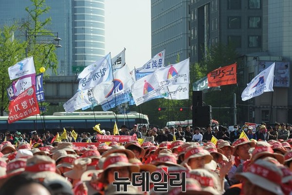 전국민주노동조합총연맹(민주노총)이 24일 오후 서울광장에서 총파업 집회를 열어 '정부 주도의 노동시장 구조개선 저지와 최저임금 인상' 등을 요구하며 출정식을 가지고 있다.