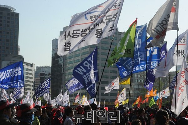 전국민주노동조합총연맹(민주노총)이 24일 오후 서울광장에서 총파업 집회를 열어 '정부 주도의 노동시장 구조개선 저지와 최저임금 인상' 등을 요구하며 출정식을 가지고 있다.
