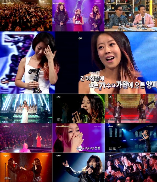지난 24일 방송된 MBC 대표 음악버라이어티 '나는 가수다-시즌3'(이하 '나가수3') 13회 마지막 회에서는 TOP3 박정현-김경호-양파의 결승전이 펼쳐졌다. 1라운드는 듀엣공연에서 박정현은 김범수와 소유&정기고의 '썸', 김경호는 신효범과 이문세&고은희의 '이별 이야기', 양파는 하현우(국카스텐)와 이문세의 '붉은 노을'을 선곡했다.