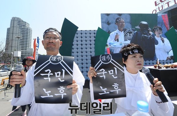 대한민국공무원노동조합총연맹(이하 '공노조')은 서울시청 광장에서 열리는 4.25 공적연금강화 국민대회에 앞서 25일 오후 서울역 광장에서 조합원 7천여명이 참여한 가운데 [국민 노후복지 장례식] 행사를 개최했다.