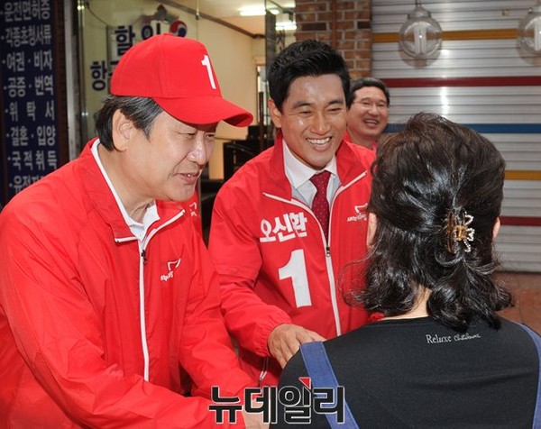 새누리당 김무성 대표가 4.29재보선 관악을에 출마한 오신환 후보와 함께 26일 오후 서울 관악구 신사시장에서 상인들을 만나 오신환 후보의 지지를 호소하고 있다.