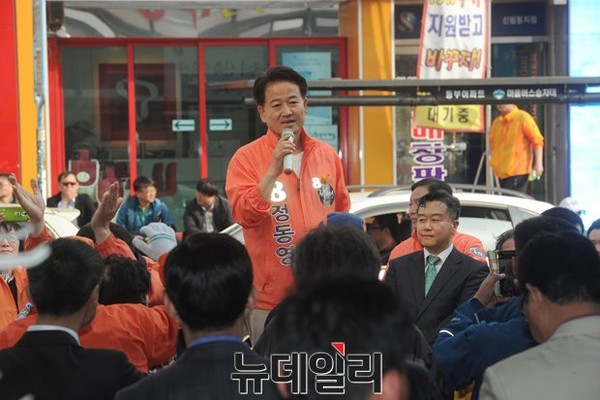 4·29재보선 서울 관악을에 출마한 국민모임 정동영 후보가 26일 서울 관악구 신림동 신원시장 입구에서 이행자 서울시의원과 함께 지역주민들에게 지지를 호소하고 있다.