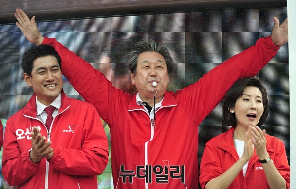 김무성 새누리당 대표가 4.29 재보궐선거를 하루 앞둔 28일 오후 서울 관악구 난곡사거리에서 호루라기를 불며 오신환 후보 지지를 호소하고 있다.