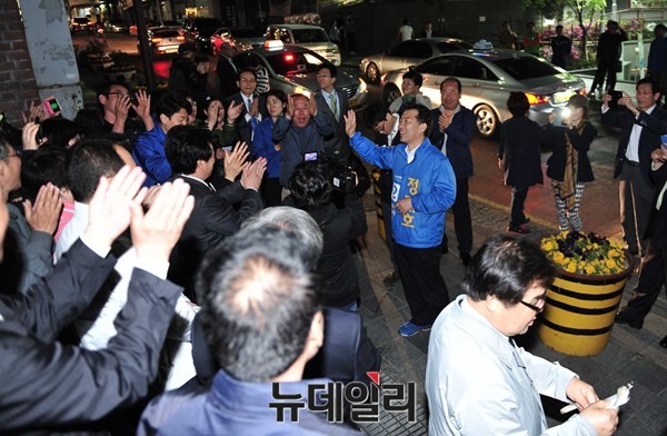 4.29재보궐선거 관악을에 출마한 새정치민주연합 정태호 후보가 28일 서울 관악구 관악청소년회관 인근에서 지지자들과 선거를 마감하고 있다.