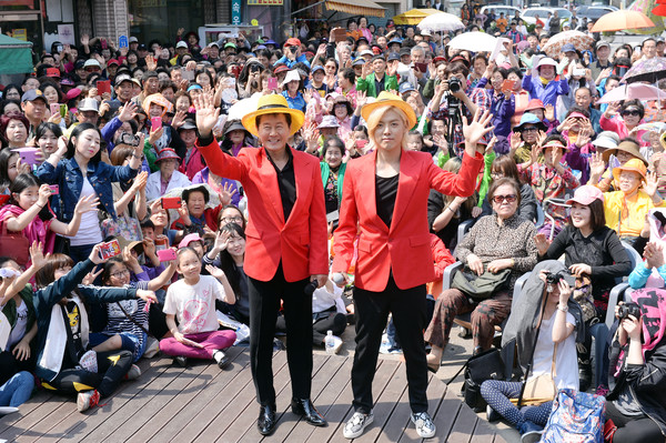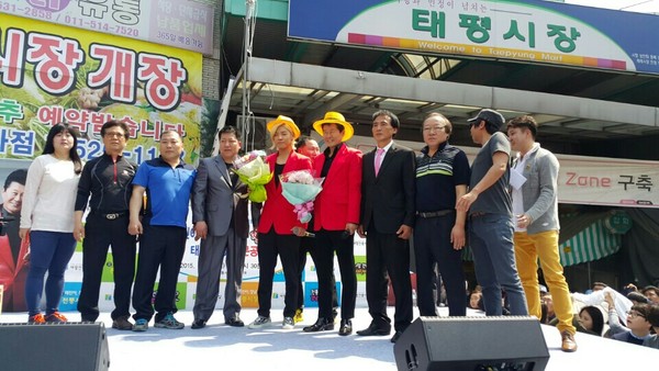 안세석 태평시장 상인번영회 회장 등 지역 관계자들로부터 감사의 꽃다발을 받은 태진아와 강남은 시장 입구에 마련된 즉석 무대에 올라 공연을 펼쳤다.