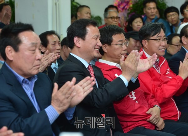 4.29재보선 성남 중원에 출마한 새누리당 신상진 후보가 29일 오후 경기 성남 중원구에 위치한 사무실에서 지지자들과 다소 차분한 표정으로 개표 방송을 지켜봤다.