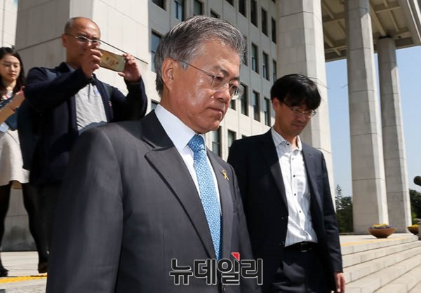 새정치민주연합 문재인 대표가 30일 오전 서울 여의도 국회 원내대표회의실에서 4.29재보선 4:0 패배와 관련해 기자회견을 갖고 회견장을 떠나고 있다.