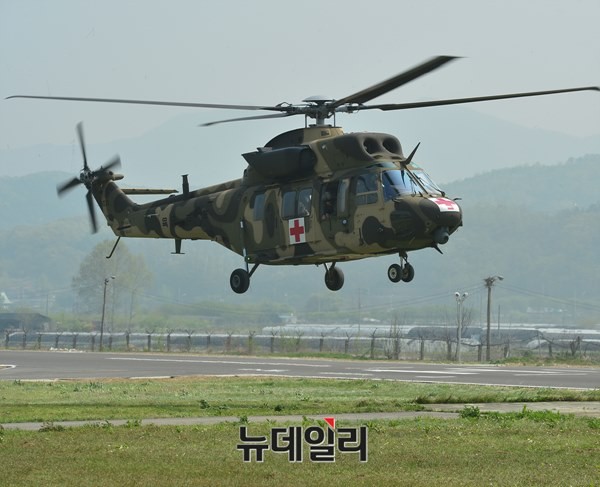 메디온이라 불리는 의무후송항공대가 창설한다.육군은 1일 경기 용인에서 항공작전사령관 김영식 중장 주관으로 응급환자 후송을 전담할 의무후송항공대 창설식을 가진다. 이날 창설식에 앞서 환자 후송 훈련을 공개했다.의무후송항공대 창설로 지금까지 춘천과 포천지역에서 수행해오던 의무후송 임무를, 수리온(KUH-1) 6대와 새로 편성된 팀이 임무를 맡게 됐다. 육군은 의무후송항공대 창설로 신속한 응급처치와 후송을 통해 골든타임을 확보해 우리 장병들을 생명을 구하는데 큰 역할을 할 것으로 기대하고 있다.항공응급후송체계는 환자가 발생한 부대에서 [군 응급환자 신고 앱]을 활용해 기존 전화로 해오던 신고를 간소화 했고, 의무후송헬기에는 응급처치세트를 장착했다.(경기 용인=뉴데일리 정상윤)