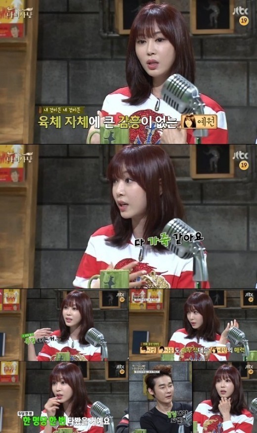 이성간에 스킨십을 그다지 좋아하지 않는다고 말한 강예원은 허지웅에게 “무성욕자 아니냐”고 물었다. MC들이 “아니다”라고 한 목소리를 내자 강예원은 “코스프레라도 하는 분이 좋다”며 독특한 취향을 자랑삼아 말했다.