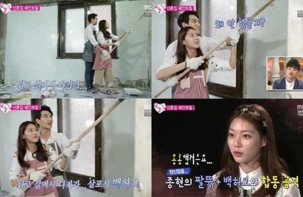 '우리 결혼했어요' 공승연이 이종현의 백허그에 부끄러움을 감추지 못했다.지난 2일 방송된 MBC '우리 결혼했어요4'(이하 우결)에서 이종현 공승연 커플은 '신혼집에 입주하라'는 미션 카드를 받고 신혼집을 꾸미는 모습이 전파를 탔다.신혼집 이곳저곳을 둘러보던 이종현과 공승연은 "일본 여행 때 얘기했던 신혼집 로망과 일치한다"며 좋아했다. 이어 본격적인 신혼집 셀프인테리어 페인트칠을 위해 서로 앞치마를 매주기 시작한 두 사람은 앞치마 허리끈으로도 모자라(?) 목에 거는 끈까지 놓치지 않고 매줬다.특히, 이종현은 공승연에 다가가 그녀가 들고 있는 페인트 붓을 들어주며 도왔고, 마치 백허그를 한 것 같은 달달한 장면이 연출됐다.이후 공승연은 제작진과의 인터뷰에서 "당시 어지러웠다. 뒤에서 껴안다시피 해서 정신이 몽롱했다"고 속내를 털어놨다.[이종현 백허그, 사진=MBC '우리결혼했어요' 방송 캡처]