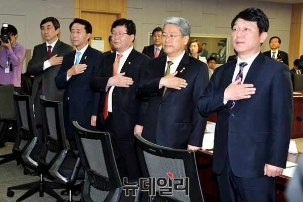 새정치민주연합 원내대표 후보 합동초청토론회가 6일 오전 서울 여의도 국회 의원회관에서 열린 가운데 최재성, 김동철, 설훈, 조정식, 이종걸 후보가 국민의례를 하고 있다.