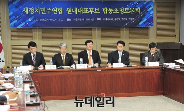 새정치민주연합 원내대표 후보 합동초청토론회가 6일 오전 서울 여의도 국회 의원회관에서 열린 가운데 최재성, 김동철, 설훈, 조정식, 이종걸 후보가 토론회 시작을 기다리고 있다.