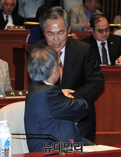 새정치민주연합 문재인 대표가 6일 오후 서울 여의도 국회에서 열린 의원총회에서 우윤근 원내대표와 인사를 나누고 있다.
