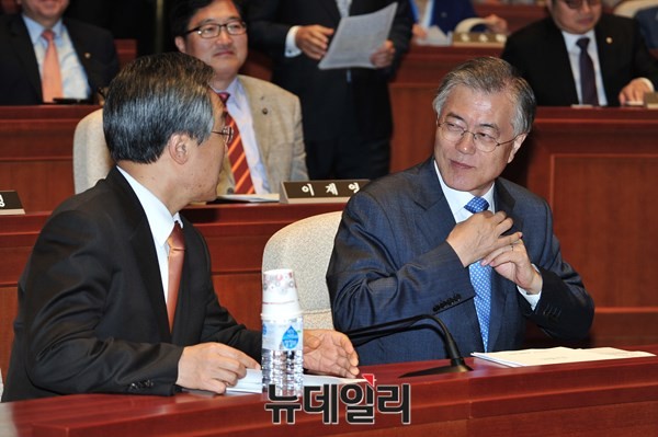 새정치민주연합 문재인 대표가 6일 오후 서울 여의도 국회에서 열린 의원총회에서 우윤근 원내대표와 대화를 나누고 있다.