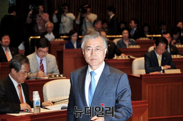 새정치민주연합 문재인 대표가 6일 오후 서울 여의도 국회에서 열린 의원총회에서 모두발언을 위해 단상으로 향하고 있다.
