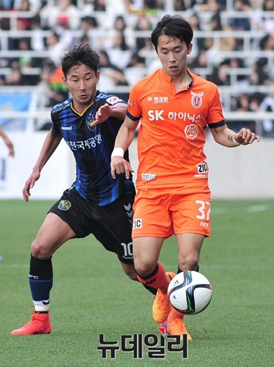 인천유나이티드 이천수 선수가 9일 인천축구전용경기장에서 열린 2015 K리그 클래식 10라운드 제주와 홈경기에서 제주유나이티드 장은규 선수에게 공을 뺏기 위해 달려가고 있다.