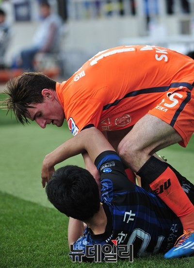 인천유나이티드 권완규 선수가 9일 인천축구전용경기장에서 열린 2015 K리그 클래식 10라운드 제주와 홈경기에서 제주유나이티드 알렉스 선수에게 공을 뺏기지 않기 위해 공을 안고 있다.