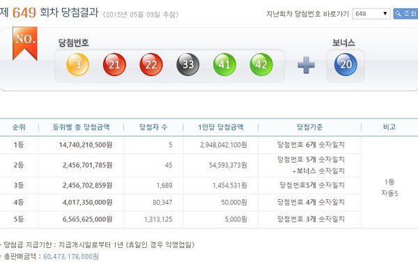 2015년 5월 9일 실시된 제649회 나눔로또 1등 당첨번호는 '3, 21, 22, 33, 41, 42'이며, 2등 보너스 번호는 20번이다.이번 로또 649회차 추첨 결과 1등 당첨자는 5명으로 29억4804만2100원의 당첨금을 받게 됐다.1등 번호 중개와 보너스 번호를 맞힌 2등은 45명이며, 1인당 5459만3373원씩 지급받는다. 당첨번호 중 5개를 맞힌 3등은 1689명으로 당첨금은 각 145만4531원이다.5만원의 당첨금을 받는 4개의 번호를 맞힌 4등은 8만347명이며, 5000원의 고정 당첨금을 받는 5등은 131만3125이 나온 것으로 집계됐다.한편, 이번주 로또649 총 판매금액은 604억7317만8000원이다.[로또649회당첨번호, 사진=로또 홈페이지 캡처]