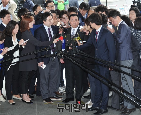 고 성완종 전 경남기업 회장으로부터 3000만원을 받았다는 의혹이 제기된 이완구 전 국무총리가 소환 조사를 받기위해 14일 오전 서울 서초구 서울고등검찰청 청사로 들어가던 중 취재진의 질문에 답하고 있다.