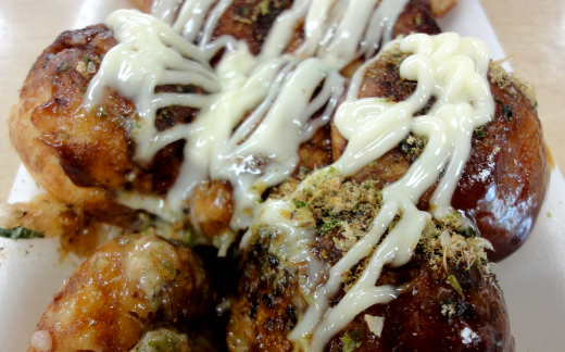 타코야키는 밀가루 반죽 안에 잘게 자른 문어, 파, 생강 절임, 텐카스, 간장 등을 넣고 한입크기의 동그란 모양의 타코야키 전용 틀에서 구워 만들어내는 음식이다.
