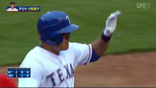 15일(이하 한국시간) 미국 텍사스 알링턴 글로브 라이프 파크에서 열린 캔자스시티 로열스와의 경기에 출전한 추신수는 0대 1로 뒤진 회말 선두타자로 나서 제레미 거스리를 상대로 우전 안타를 기록했다.