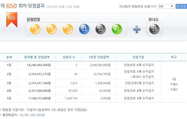 2015년 5월 16일 실시된 제650회 나눔로또 1등 당첨번호는 '3, 4, 7, 11, 31, 41'이며, 2등 보너스 번호는 35번이다.이번 로또 650회차 추첨 결과 1등 당첨자는 5명으로 28억4929만8900원의 당첨금을 받게 됐다.1등 번호 중개와 보너스 번호를 맞힌 2등은 45명이며, 1인당 5276만4795원씩 지급받는다. 당첨번호 중 5개를 맞힌 3등은 1814명으로 당첨금은 각 130만8940원이다.5만원의 당첨금을 받는 4개의 번호를 맞힌 4등은 8만7030명이며, 5000원의 고정 당첨금을 받는 5등은 142만9743이 나온 것으로 집계됐다.한편, 이번주 로또650 총 판매금액은 609억9108만2000원이다.[로또650회당첨번호, 사진=로또 홈페이지 캡처]