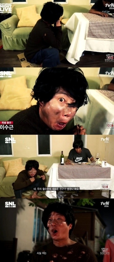 도박 혐의로 자숙 중이던 이수근이 1년 6개월 만에 모습을 드러냈다.지난 16일 방송된 tvN 'SNL코리아6'에서는 개그맨 김병만이 호스트로 출연해 개그본능을 아낌없이 발산했다.이날 김병만은 영화 '늑대소년'을 패러디한 '궁금한 이야기 WHY-늑대소년, 5년 후' 코너에서 늑대소년 '철수'로 변신해 색다른 웃음을 선사했다.특히, 이수근은 김병만의 친구인 새로운 늑대소년으로 등장해 바닥에 떨어진 고기를 주워먹는 등 몸을 사리지 않는 코믹연기를 선보였다.덥수룩한 머리에 누더기 옷, 새까만 손톱 분장을 한 이수근은 김병만의 뒤통수를 치던 중 머리를 방망이로 맞기도 해 웃음을 자아냈다.한편, 이수근은 2009년 5월부터 2012년 3월까지 3억7000만원 상당의 돈이 걸린 불법 스포츠 도박을 한 혐의로 지난해 12월 징역 6월에 집행유예 1년을 선고받았다.['SNL코리아' 이수근 늑대소년, 사진=tvN 'SNL코리아6' 방송 캡처]